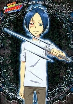 一位蓝紫色发色凤梨发型的男童拿着一把和他手臂差不多长的三叉戟的头,左眼是蓝色,右眼是红色,里面有个“六”