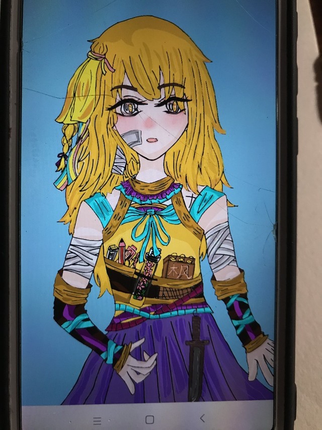 枫晓雪【脖子上的花边,源自于原设基础上加的,肩上的带子,源自于我自己就很喜欢这种属性,胸前的蝴蝶结是与露出来的蓝色的边是一套,市里面的一件衣服,手上的绷带来源于最基本的原设,手套来源于伤口,现在的设定来源于,ink,旧设的手上那两撮,算是灵感啦,换而言之,那个腰上的袋子也是,三条颜色不同的像是带的东西,来源于自己挂在墙上的彩带,头上蝴蝶结来源于最基本的随手一画,鞋子是因为,最基本的原设是有战争题材,所以从长筒靴改过来的,繁琐的丝袜裤子,是因为自己超!不喜欢穿裙子!于是,我画的每一个肯定要有安全裤,脸上的贴,也是来源于最基本的原设,后面的一条辫子也是】