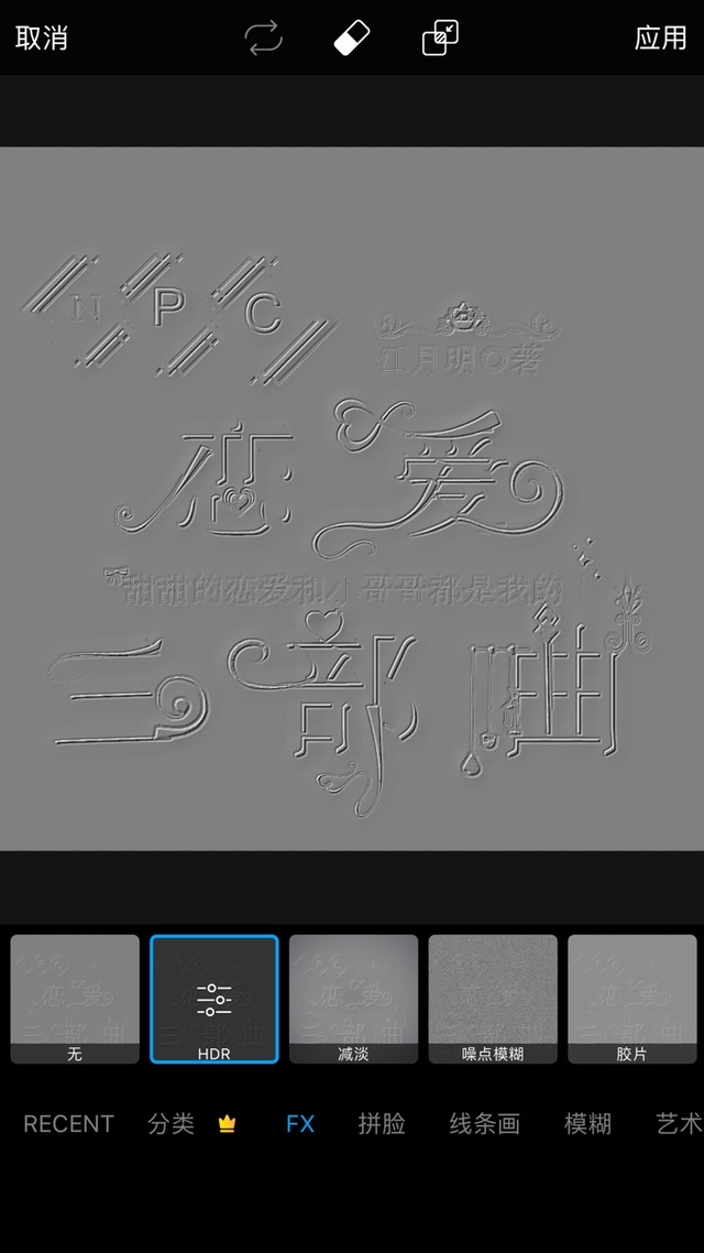 店长.月明再添加一张字设,直接点特效,和之前一样,艺术效果-浮雕,应用,再点特效-艺术效果-草绘1,应用,放大重合字设,混合,第二个正片叠低。