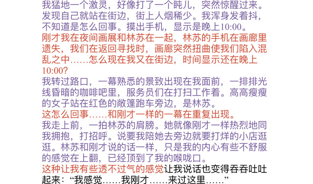 就在这时,我话才刚落,就感觉脚下的彩色楼梯开始扭曲起来,艺术隧道变得越来越窄,扁平起来。墙上的画也开始倾斜,扭曲向不同的方向。我和林苏惊恐地喊叫着,整个长廊回响起我们的叫声……