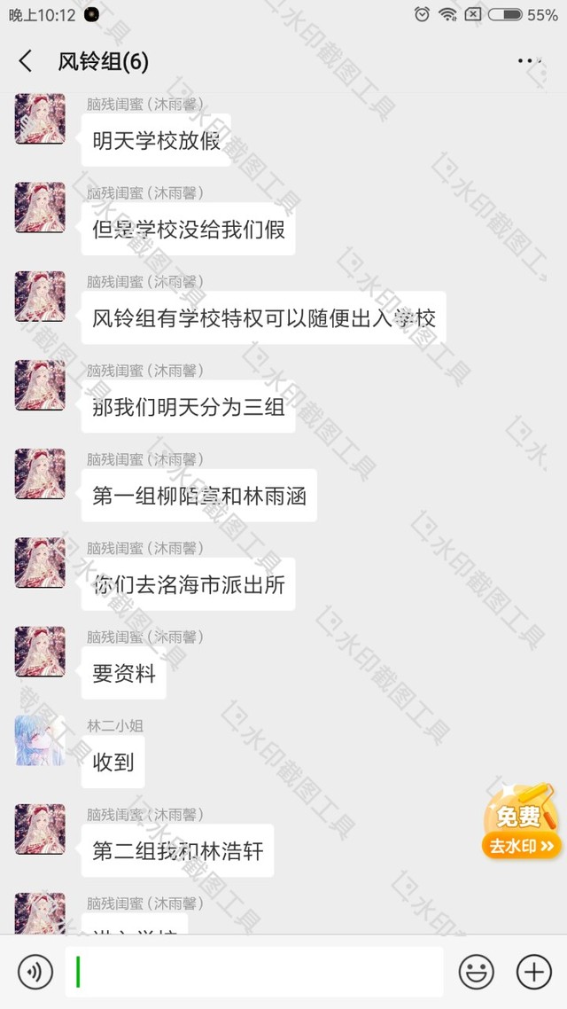 周三来了,这一天学校放假。学校给风铃组一个特权,风铃组的人可以随时出入学校办案