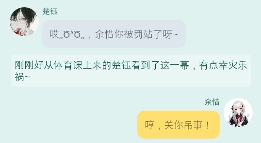 安可可看见楚钰靠在楼梯间的墙壁上,有些害羞,慢慢走到楚钰面前,边鞠躬边说