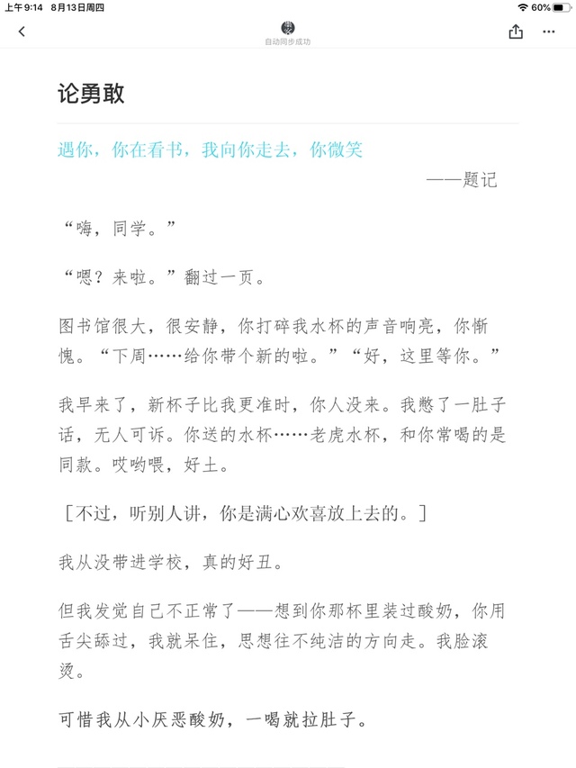 但我发觉自己不正常了——想到你那杯里装过酸奶,你用舌尖舔过,我就呆住,思想往不纯洁的方向走。我脸滚烫。