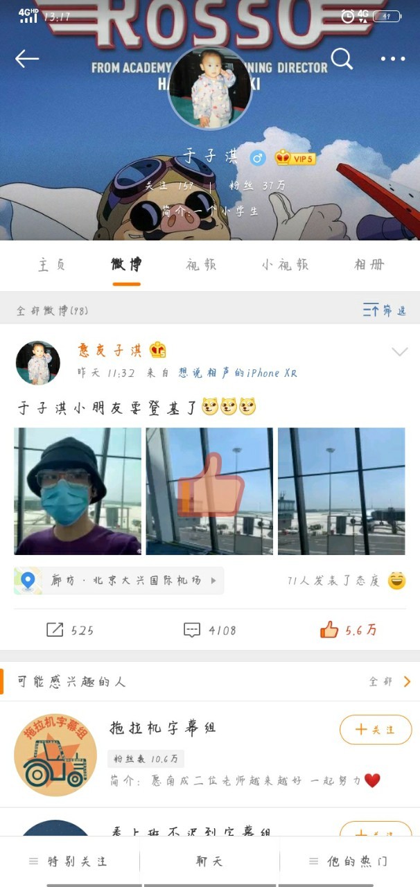 子淇前几天坐飞机回上海过生日