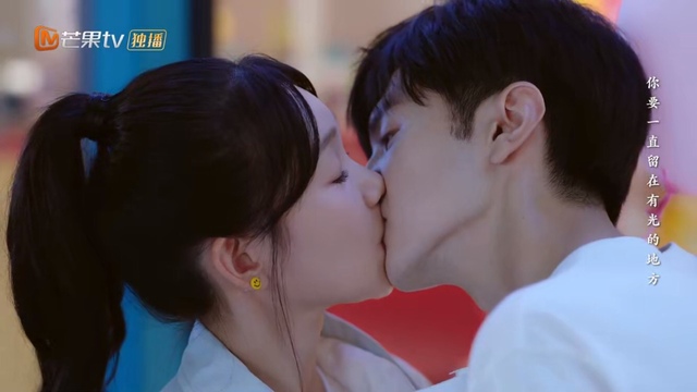 接着,镜头里。外面下着大雨,男女主在小卖部门口,在那样的环境怎么可能会没有甜甜的吻呢?就这样,传说中的气球吻就出现了