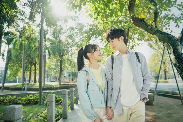 最后,姐妹看着男女主穿着情侣装,手牵手走在林阴树下,抬头看着对方