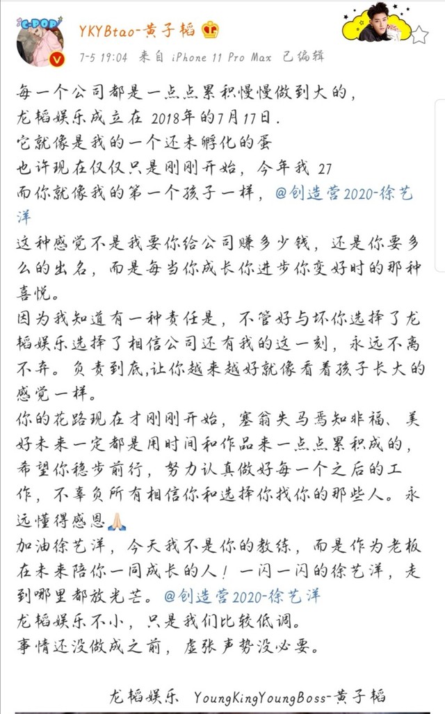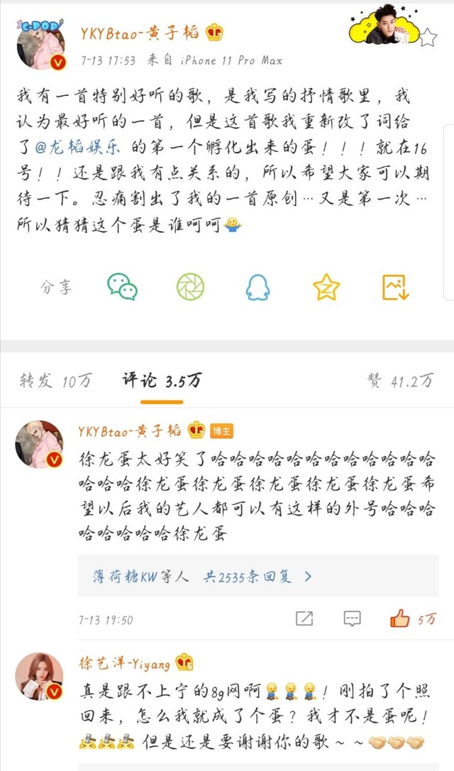 徐艺洋和黄子韬纷纷发了微博,尤其是黄子韬那一句“龙韬娱乐不小,只是我们比较低调”成功的上了热搜,第二天的的“唯一关注”也让黄子韬和徐艺洋再次占领热搜榜。