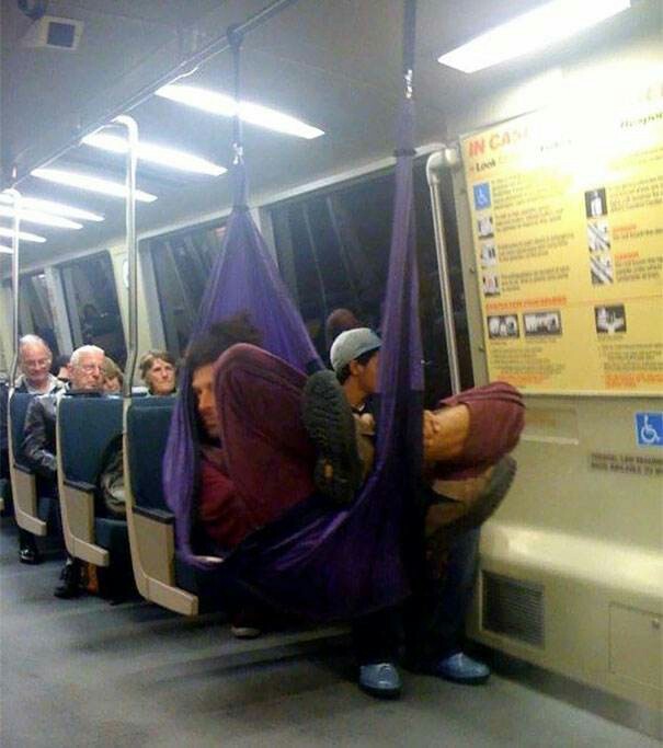 莫非走着走着,发现这位小哥,太厉害了,把吊床直接挂在地铁上,瞧,还睡得挺香的。