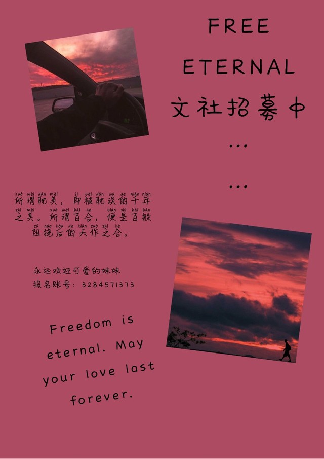 取名Free Etarnal,意为自由且永恒。熟悉我的朋友应该都知道我一直都呆在线下的那种文学工作室里面,所以我准备在这种线上的文学社办一些关于线下才会有的东西。