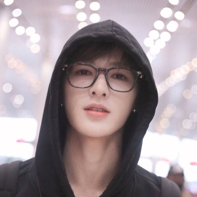 简单的黑色卫衣黑色长裤,头上还戴着卫衣的兜帽,鼻梁上一副黑框眼镜,全身没有任何多余的颜色跟装饰。
