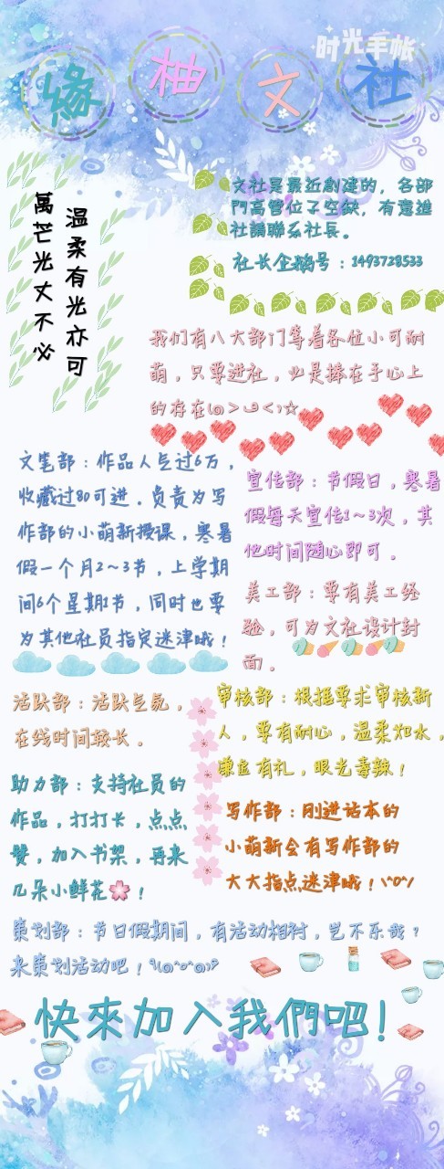 小缓小缓占一章宣传一下我们文社哈,不感兴趣的就当没看见,出门左转,别杠,谢谢。