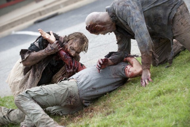 原本正在咬人的“人”,拖动着僵硬的身体回头看着拿着枪的警察。