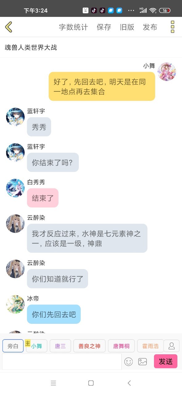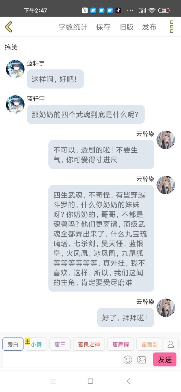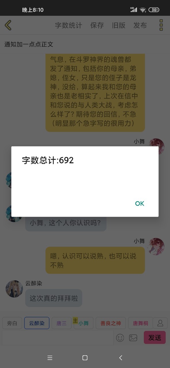 小舞给尊敬的唐舞桐小姐:您好,唐舞桐小姐 您身上有魂兽的气息,在斗罗神界的魂兽都发了通知,包括你的母亲,弟媳,侄女,只是您的侄子是龙神,没给,算起来我和您的母亲也是老相实了,上次在信中和您说的与人类大战,考虑怎么样了?期待您的回信,不急(明显那个急字写的很用力)