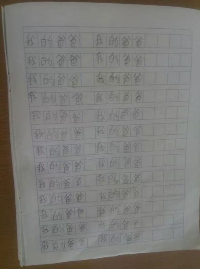 暑假在辅导班时,恰巧自习看到一个娃没有作业做,我就出了一道作文题《我的爸爸》,写七行即可。很快这娃就完飞速地完成了,而且还写满了一版……你们欣赏一下。😒