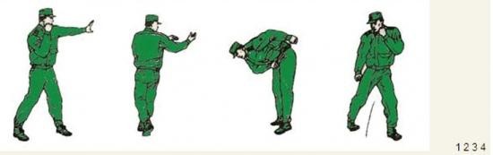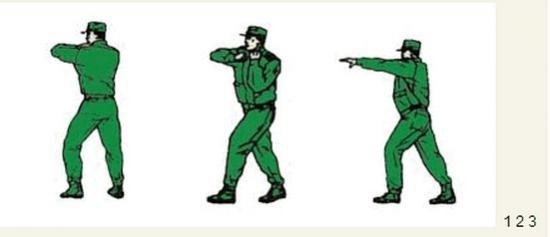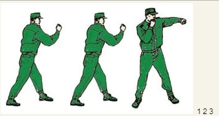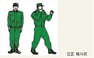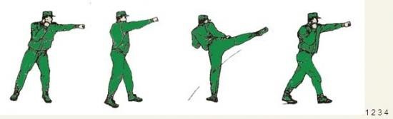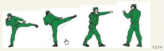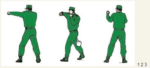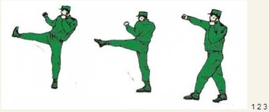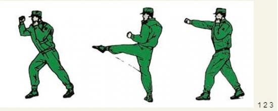 君子颜八、侧踹横踢 动作要领:右掌变拳置于下颌,同时右脚向前垫步,起左腿侧踹,接右横踢,右脚落步,出左直拳(不收回),两眼目视前方;左后转身180度成格斗式,目视前方。