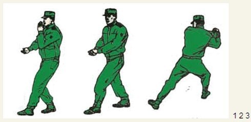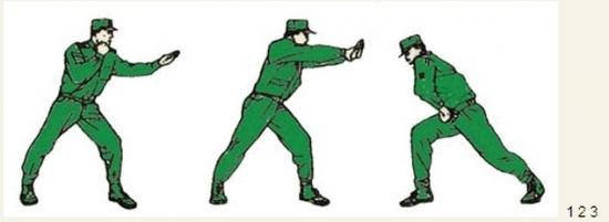 君子颜六、拉肘别臂 动作要领:进步的同时,左手由下向前上方插掌,掌心向右,略低于肩,右拳置于下颌;随即右手抓握左手腕,左手握拳,身体向右转体成右弓步,同时两手猛力后拉,身体下压,两手置于腹前,两眼目视前下方。