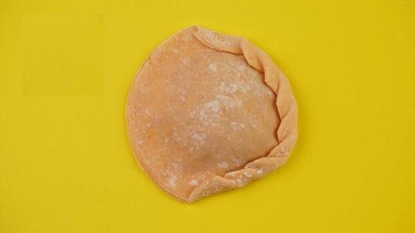 葵花形:在饺子皮中间放上适量肉馅,再取一张饺子皮覆盖在肉馅上,粘合边缘,用手在饺子皮上顺着一个方向依次翻起一角,粘合即可。