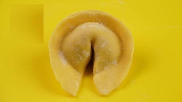 元宝形:饺子皮放入适量肉馅,对折成半圆形,封口捏紧,把饺子两端向中间弯拢,捏牢,整理下形状,使半圆形的边微微向上翘即可。