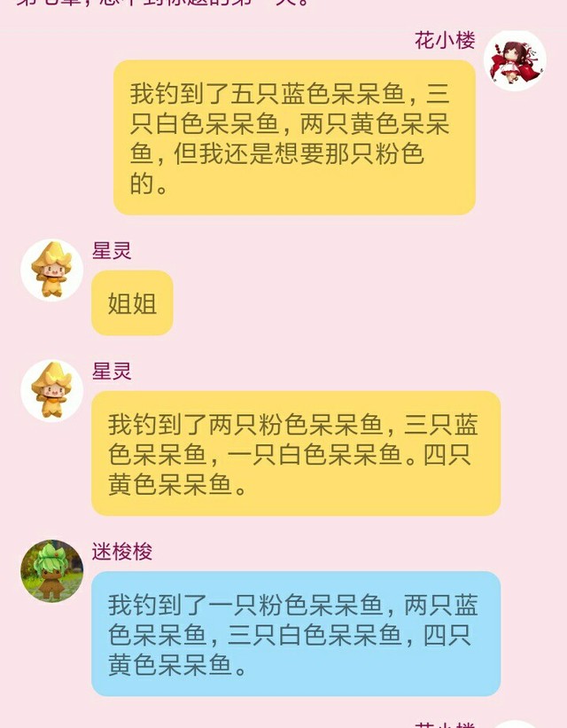 花小楼我钓到了五只蓝色呆呆鱼,三只白色呆呆鱼,两只黄色呆呆鱼,但我还是想要那只粉色的。