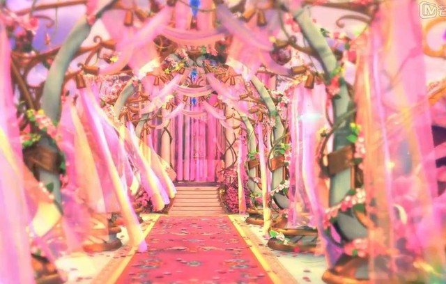 内色调为粉色, 花玲蝶纷飞,周围长满了大红色的大花。显得华丽,如婚礼殿堂般的布景