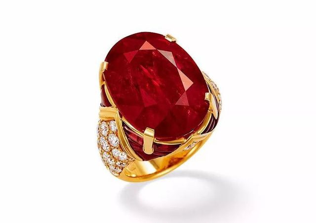 路人abcd主持人:这是一枚看上去非常奢华的戒指,在戒指的中心我们可以看到一颗成色相当完美、没有经历过加热的红宝石,戒身则是由纯金打造而成,设计师还非常巧妙的在上面镶嵌了数颗成色相当不错的钻石,更是让整个戒指的档次抬高了不少