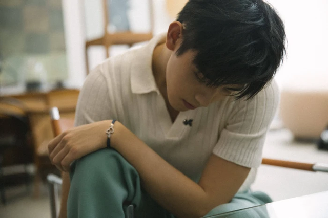 椅子上的人低着头,黑发垂落,遮眼。