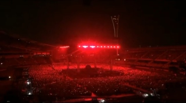 忽然场馆的灯关了,火星红色的应援棒都亮了起来,场面十分壮观。