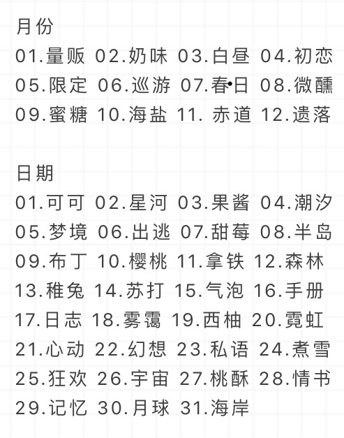 作者哒哒比如说绯影的生日是9月14日,那就在月份那里找到9的那个数字,9那里是蜜糖;然后再在日期那里找到14那个数字,14那里是苏打,那组合起来就是“蜜糖苏打”