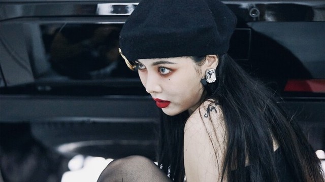 金泫雅走在最前面,带着一副墨镜,耳朵上带着夸张的饰品,一头棕色的大波浪穿着一身名牌像是在走秀的一样。