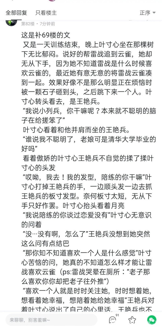 今天又是美好的一天,站在队列里的叶寸心,默默的想着如何拉近雷战与教导员的关系。一旁红细胞的王艳兵眼睛不时看向女兵队列里的叶寸心,一旁队友们表示丢人,这小子昨天跟着那姑娘一天了今天又是不时的盯着人家看,就算是喜欢人家也不用表现的这么明显吧。何晨光则是在一旁想着如何帮王艳兵把叶寸心撬到手,王艳兵正看着叶寸心出神女兵队列里的叶寸心感觉有人在看她转过头去发现了那个陪练的,二人视线相对,王艳兵看到叶寸心也看向他赶忙转过头去,虽说没什么反应却悄悄红了耳根。