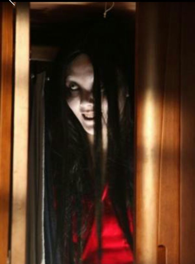 做工粗糙的红色“监狱服”,披散着头发,周围的红光让她在黑暗中变得显眼,吓人……