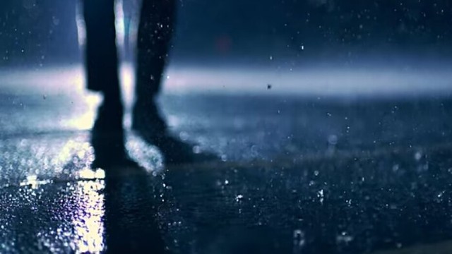 午夜空中下着小雨伴随着很大的雷声房屋外面