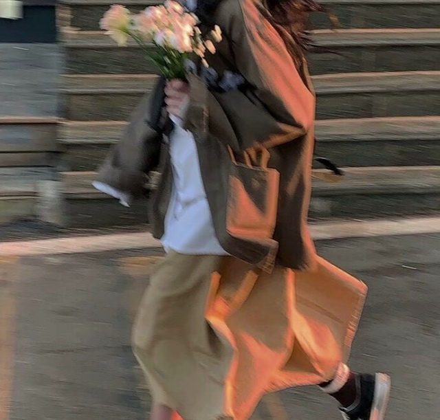 她抱着花跑过来.