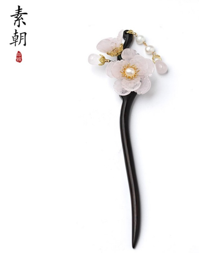 延禧宫里,皇帝赏赐安陵容的是两支桃花簪,一支是素银珍珠桃花簪,另一支钗是水晶白玉簪,花瓣是用粉晶做的,缀上了白玉流苏,巧夺天工,几乎可以以假乱真。