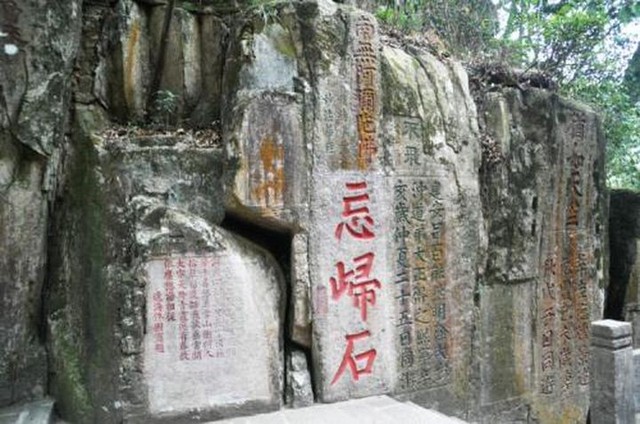 这些石刻里面,最突出的是那三个带红漆的大字,忘归石。忘归,人来在此山后,置身于山中景色,忘却了归去。这里果然是个好地方!