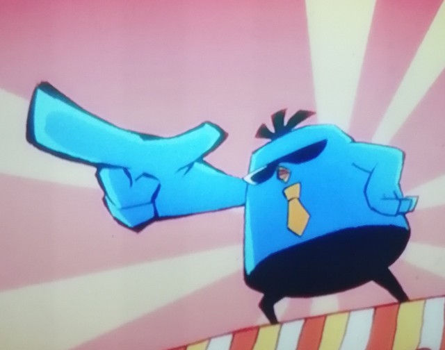 鸡大保(背对着两人)叫你们去剪个头发而已,搞到又爆炸又什么的。(把两个馒头扔给两人)任务失败,只能吃馒头啦。