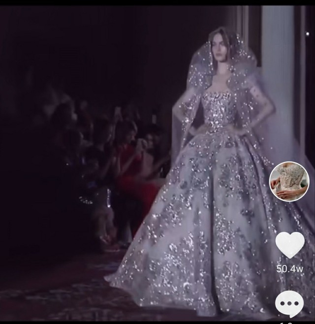 长歌到婚纱是请的国际上很有名气的大师做的用蓝色和粉色的碎钻点缀,用银线缝上花纹显得充满梦幻
