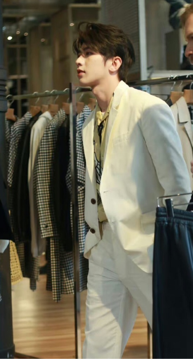 王俊凯一身米白色的西装外套让人眼前一亮,白色的纯真和他青春阳光的气质呼应。搭配黑色袖口,简约中流露出高级感,郑重却又将俏皮展现出来。以纯白色衬衫做内搭,浅色系的搭配增加少年感;衬衫扣到尽头,增添了一丝禁欲感,黑色的口子又和袖口相呼应,细节感十足;同时,内搭衬衫的侧兜,增加了设计感,带来极佳视觉效果。