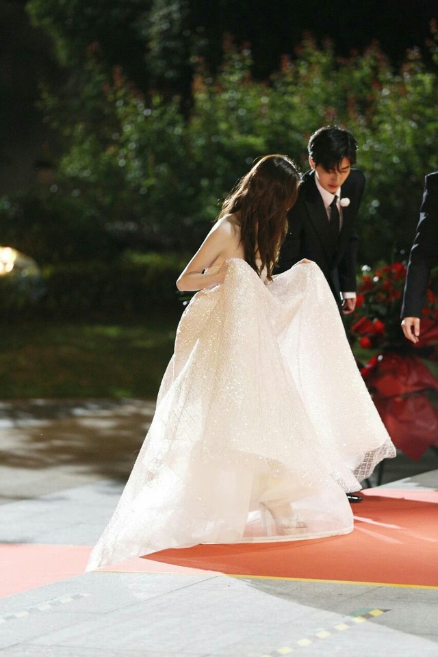 她寻着台阶拾级而上,而他已去到她的身旁为她轻轻提起了长裙,小心翼翼生怕她不小心摔了。