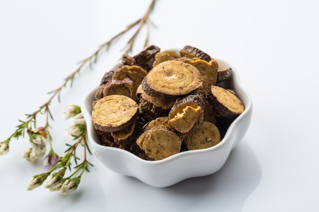 “甘草,豆科甘草属多年生草本,根与根状茎粗壮,是一种补益中草药。药材性状根呈圆柱形,外皮松紧不一,表面红棕色或灰棕色。主治清热解毒、祛痰止咳、脘腹等。”