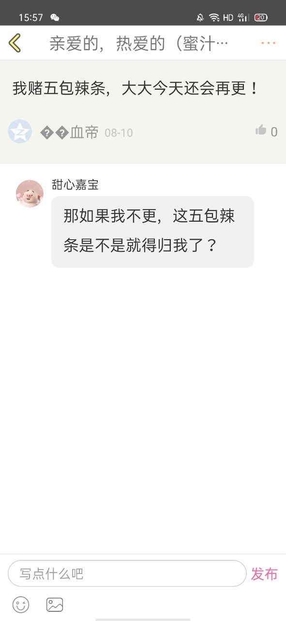 可爱的作者大大对了,在我上一部作品中完结的一话中评论的最有意思的一个人,是不是应该给我五包辣条?