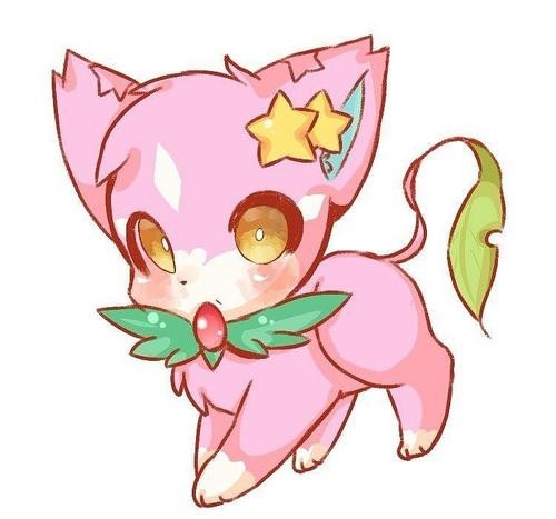 全身粉红色的,带着绿色的领导,叶子形状的尾巴,头上带着两个黄色的星星,黄色的眼睛,显出了小精灵的可爱,呆萌