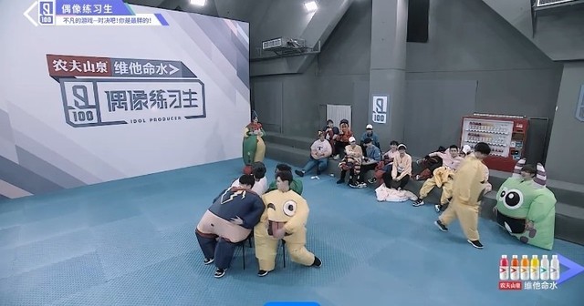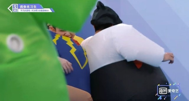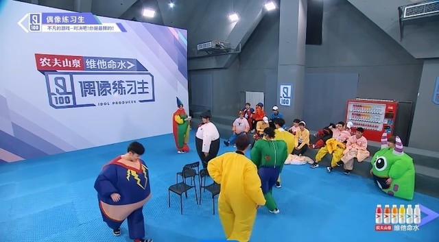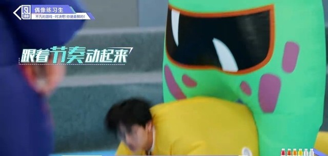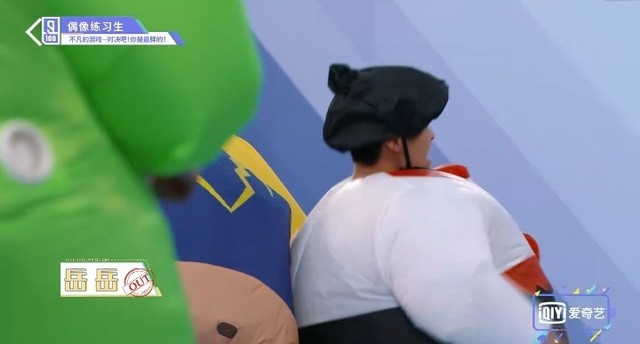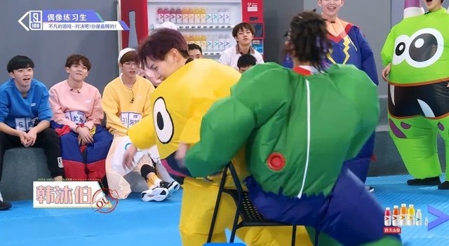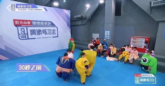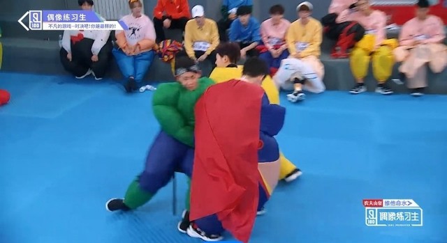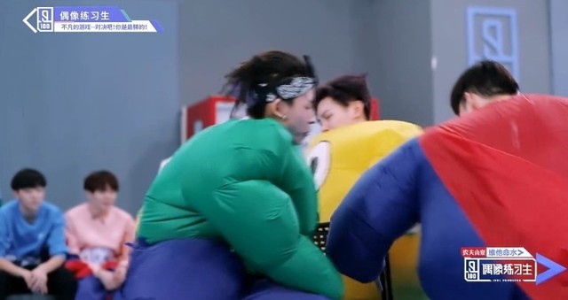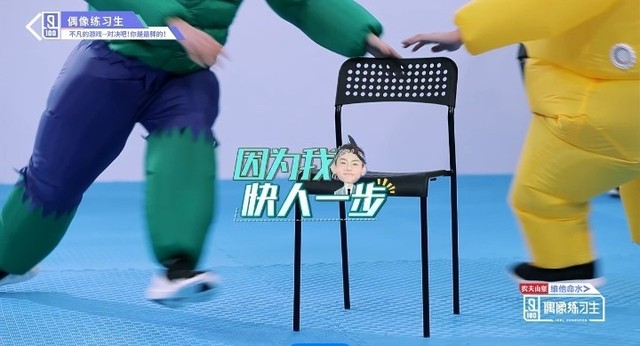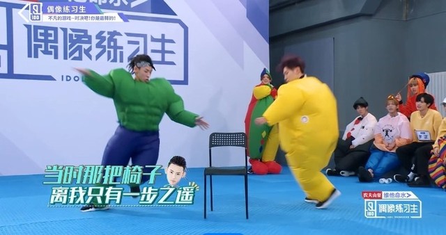 音乐停止,穿着胖胖服的练习生们开始抢椅子