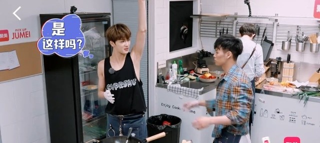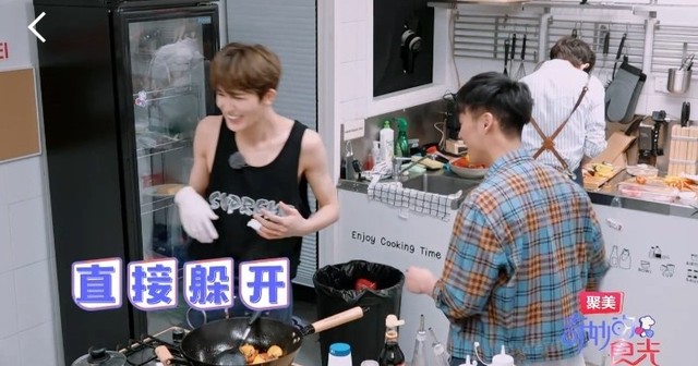 朱正廷但是你这样来回…它应该先做肉,你把这里先停了,然后单独拿个锅先炒点肉,炒好了直接放在里面,然后再一起炒。干嘛这么紧张,感觉一滩血沾到自己的衣服上,你也太过分了