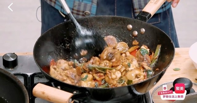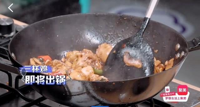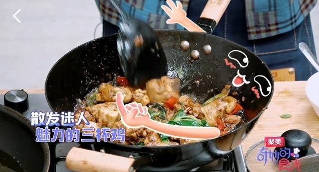 董又霖从锅里用叉子叉出一块三杯鸡,放在黄新淳的铲子上让他品尝