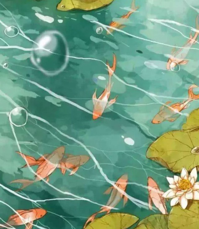 清澈见底的溪水里,游动着几只红色鲤鱼。