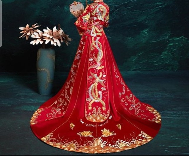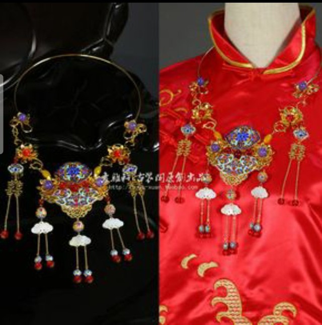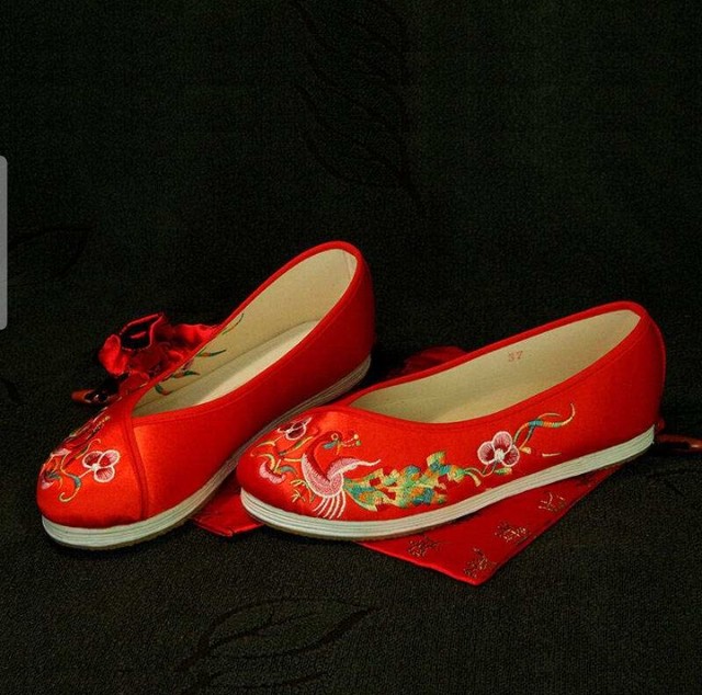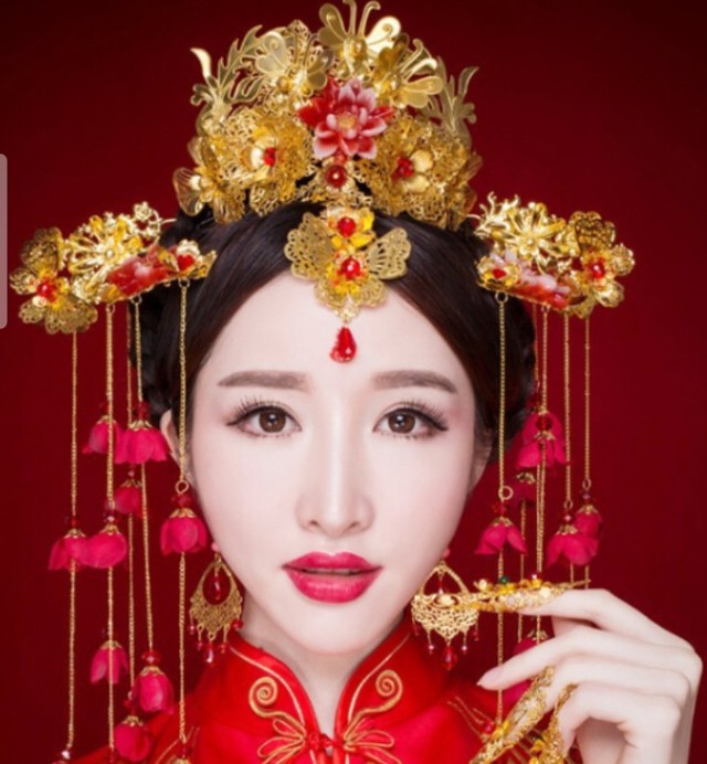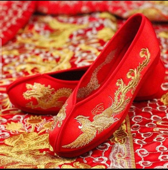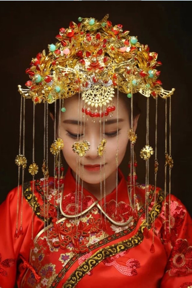 两个新娘子,头戴凤冠,脸遮红方巾,项戴红色的璎珞,双手带金镯,脚穿红缎绣花鞋;一身千娇百媚,喜气洋洋。