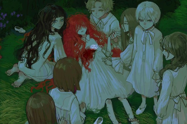 我就像这个红发女孩一样,穿着这身漂亮的白衣服躺在这软软的草坪上,一动不动,还被自己滚烫又恶心的血液渲染着,无人知晓我的感受,我只是一具无法动弹的尸体。