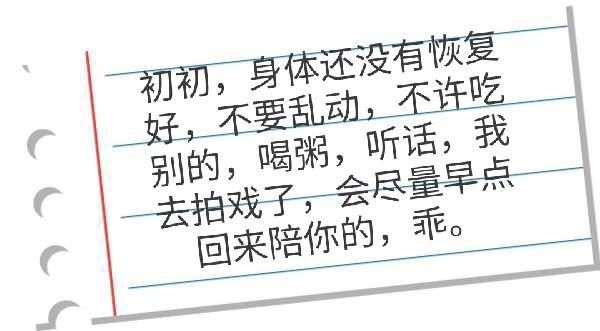 顾如初“初初,身体还没有恢复好,不要乱动,不许吃别的,喝粥,听话,我去拍戏了,会尽量早点回来陪你的,乖。”