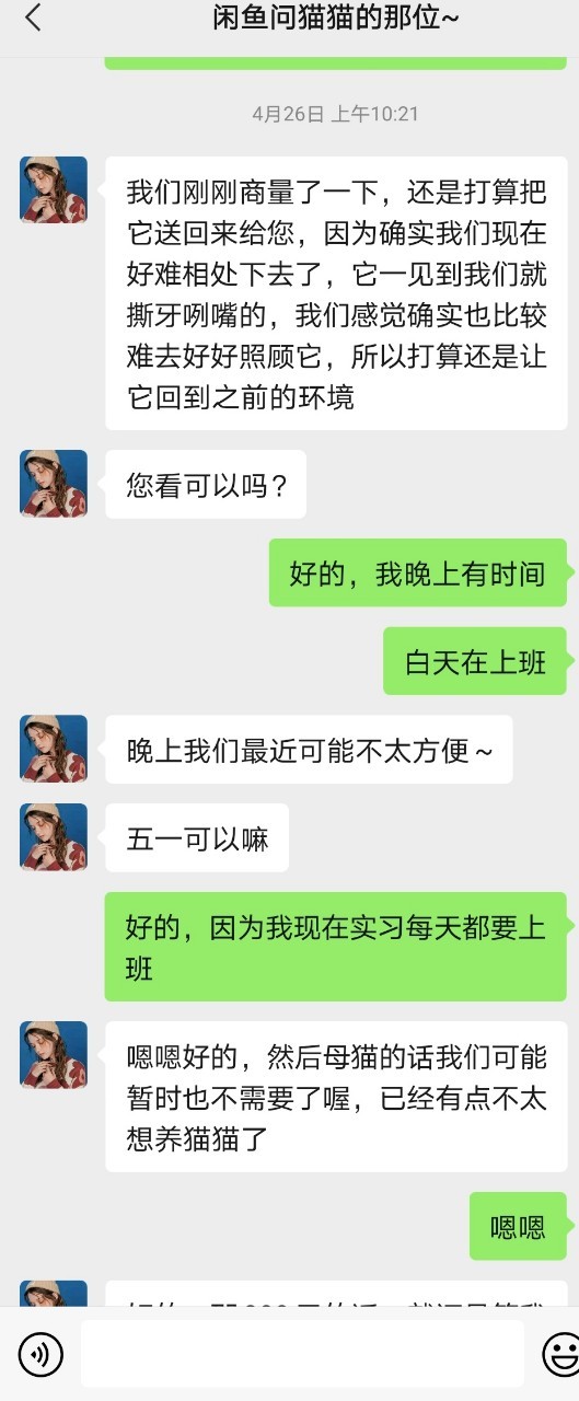 看到自己的猫受委屈,林初九就决定让他们可以原路返还猫咪,猫没事。钱就可以退了,自己忙也继续养着。